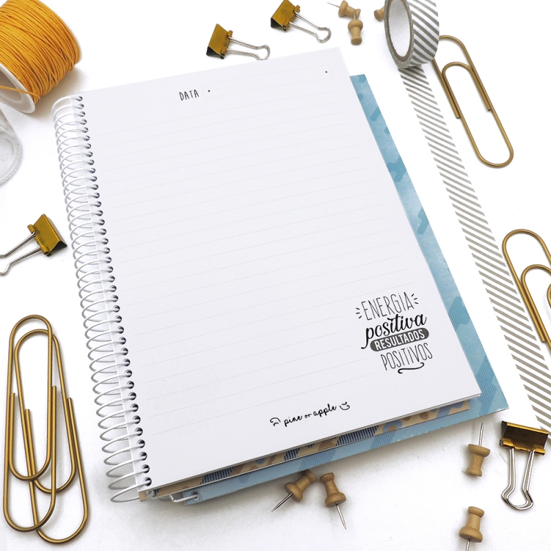 Caderno de linhas com 80 folhas pautadas e 5 frases motivacionais.