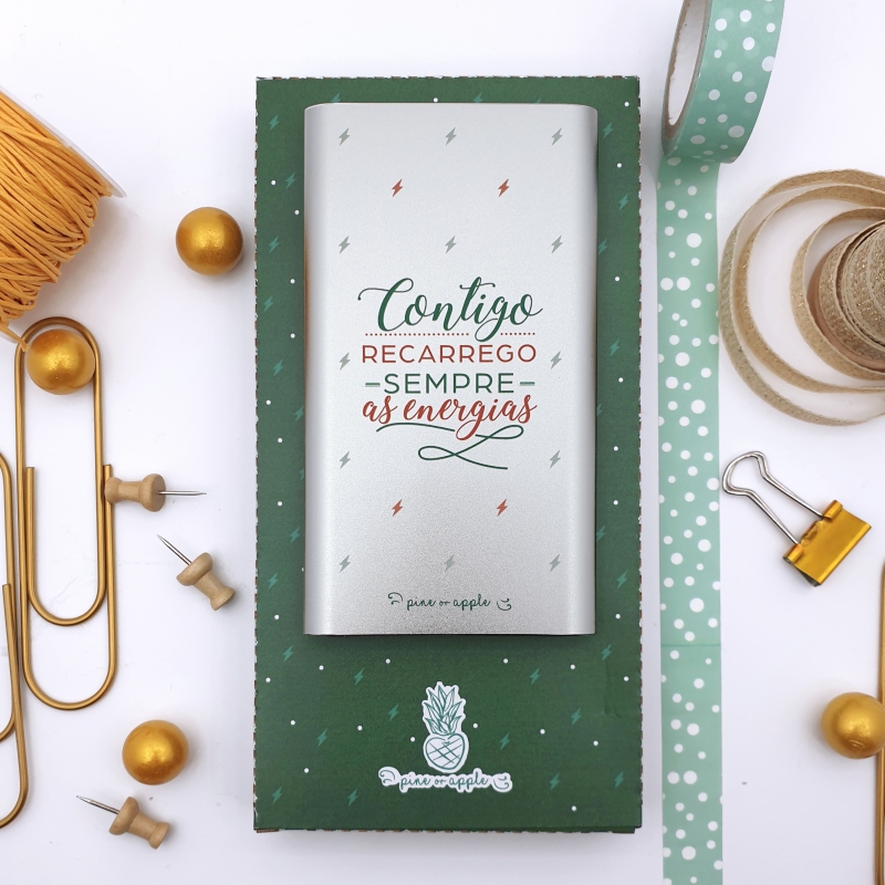 A cor da caixa da power bank poderá ser a verde se para Ele, e a Bordeaux se para Ela. Escolha nas definições.