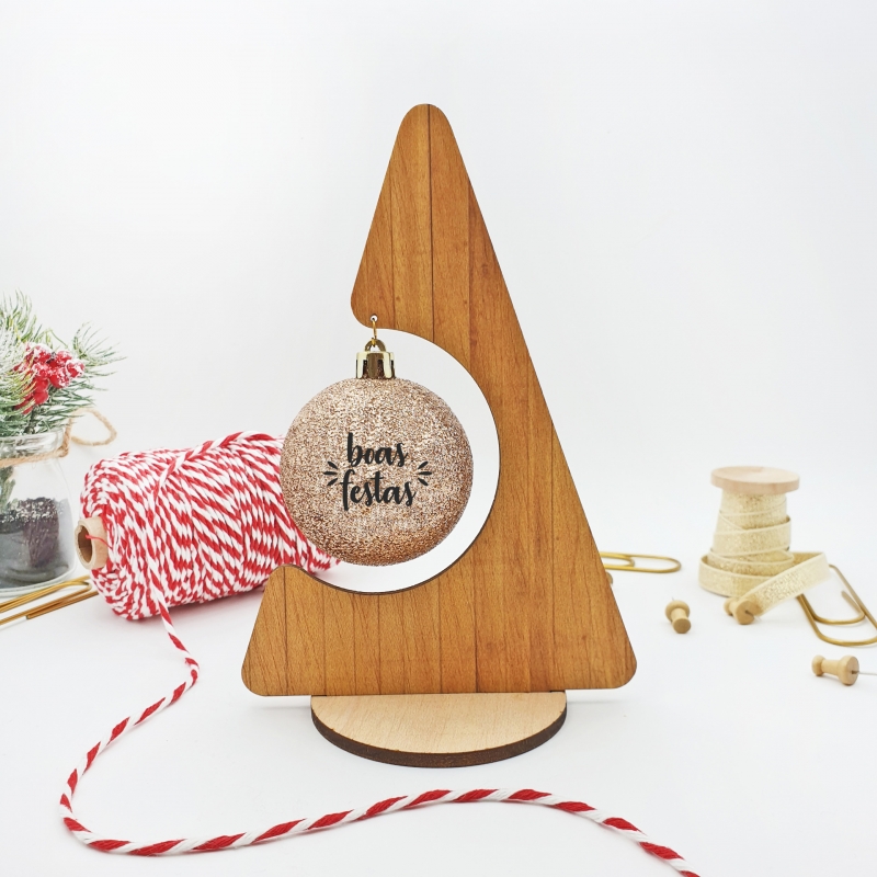 Aqui está a nossa mini árvore de Natal em madeira. Cada mini árvore trás uma bola personalizada.